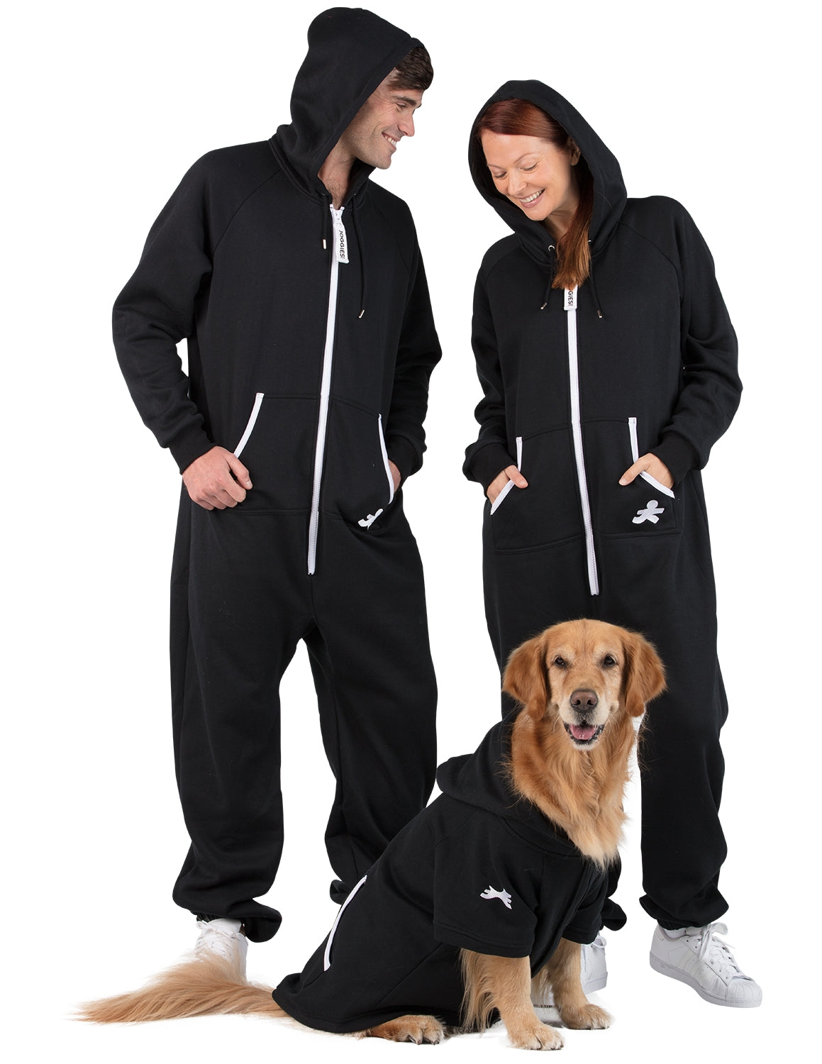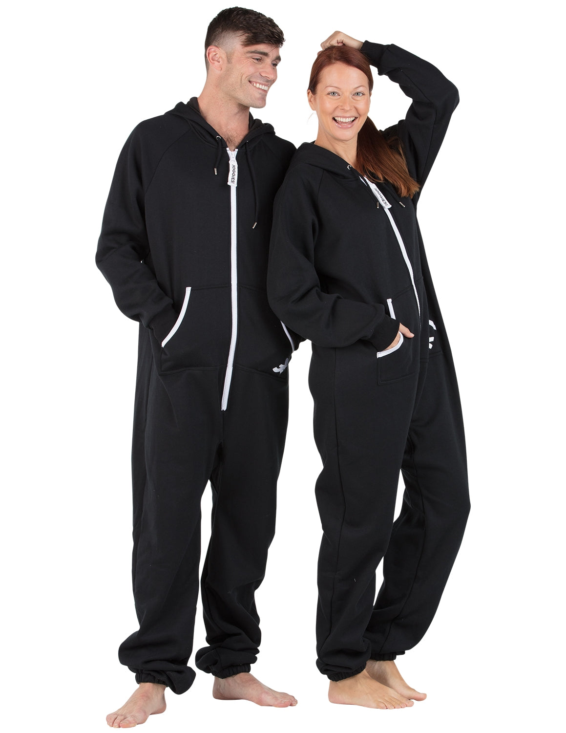 Joggies are the perfect mix between a sweat suit and onesie pajamas! Stylish and ultra-cozy! The thick sweatshirt fleece is ideal for walking the dog on the chilly mornings, enjoying a bonfire while camping, and for sleeping in, too! Roll out of bed ready for the day! Both women and men will love and look great in these black beauties! And an inclusive size chart makes these the best plus size one piece jogging suits!