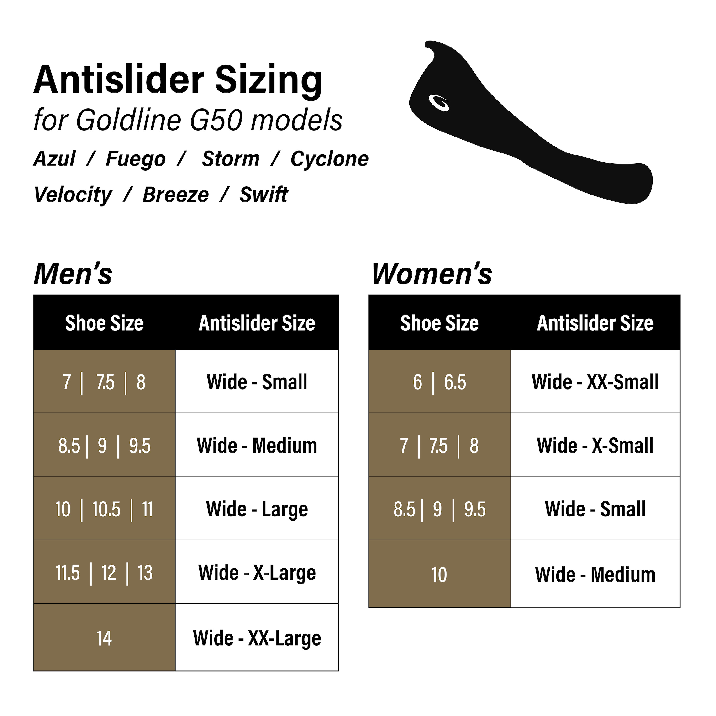 - Goldline recommends a wide Antislider for these shoes. Sold separately.