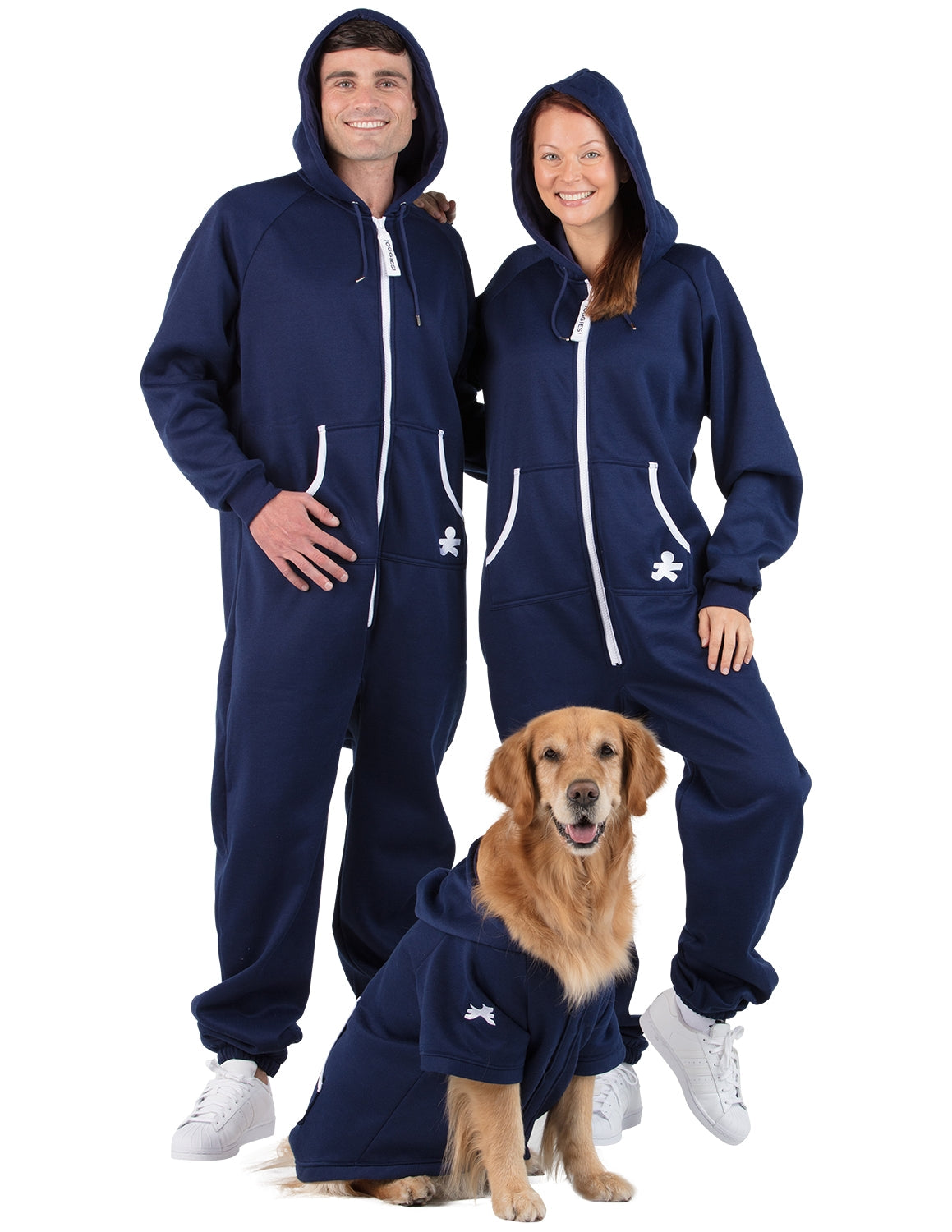 The perfect mix between a sweat suit and one piece pajamas! Super stylish with hoodies, pockets with white piping and white zippers! Roll out of bed ready for the day! Great for sleeping in and as laid-back outerwear! Both women and men will love and look gorgeous in these Navy blue jumpers for adults.