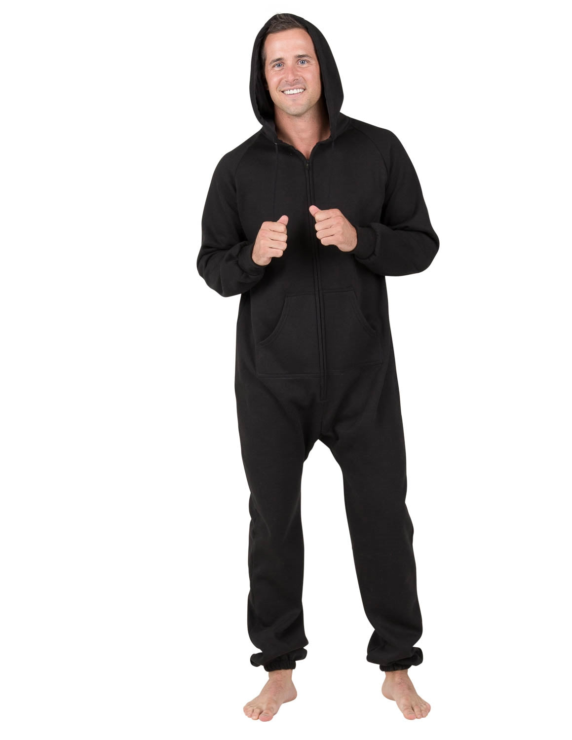 The perfect mix between a track suit and one piece pajamas! Sweat shirt fleece with hoodie’s and front pockets make these joggers extra stylish! Roll out of bed ready for the day! Great for sleeping in and as laid-back outerwear! Both women and men will love and look gorgeous in these black footless onesie’s for adults.