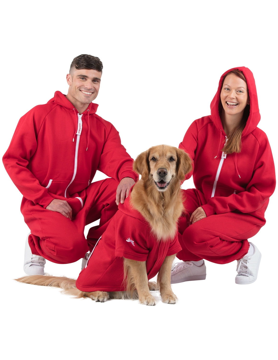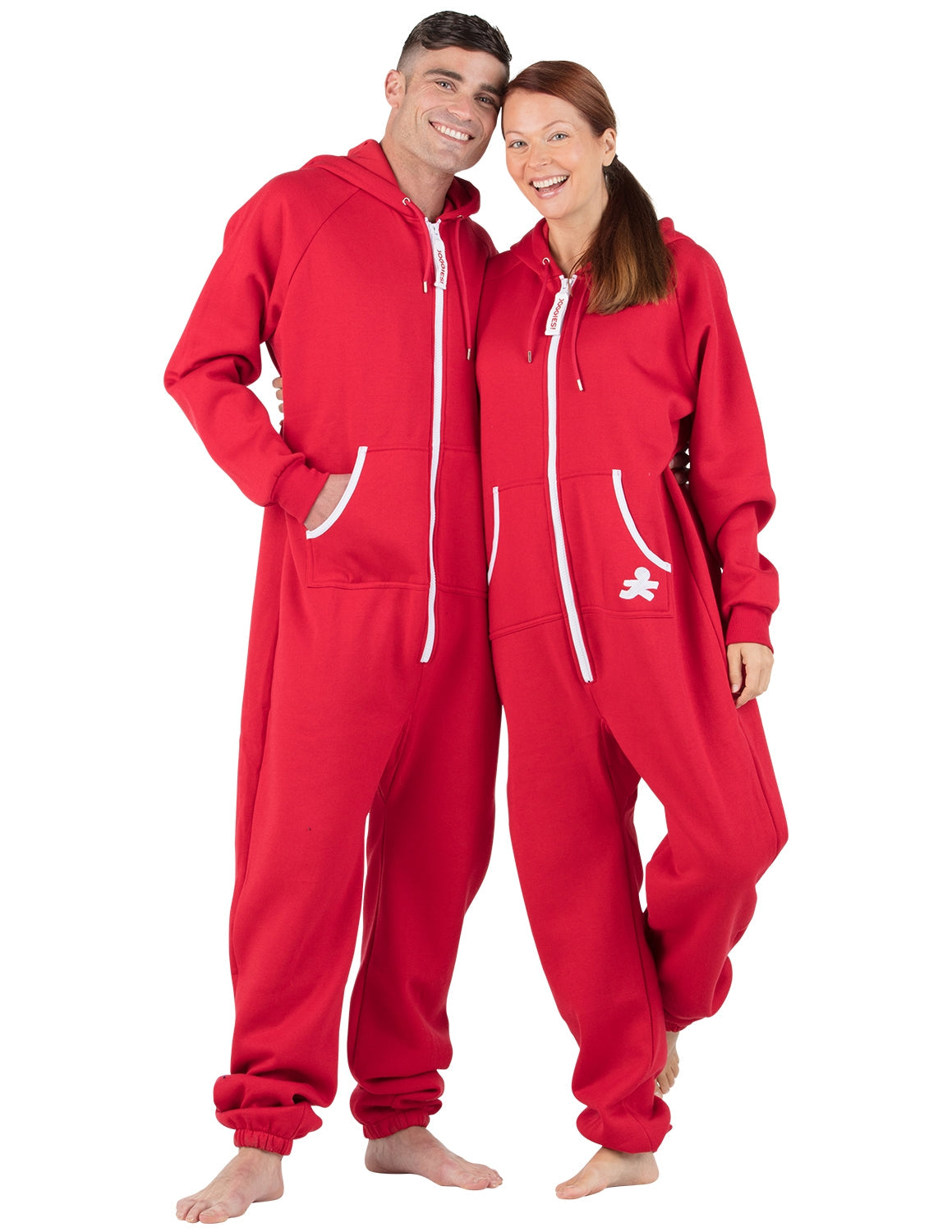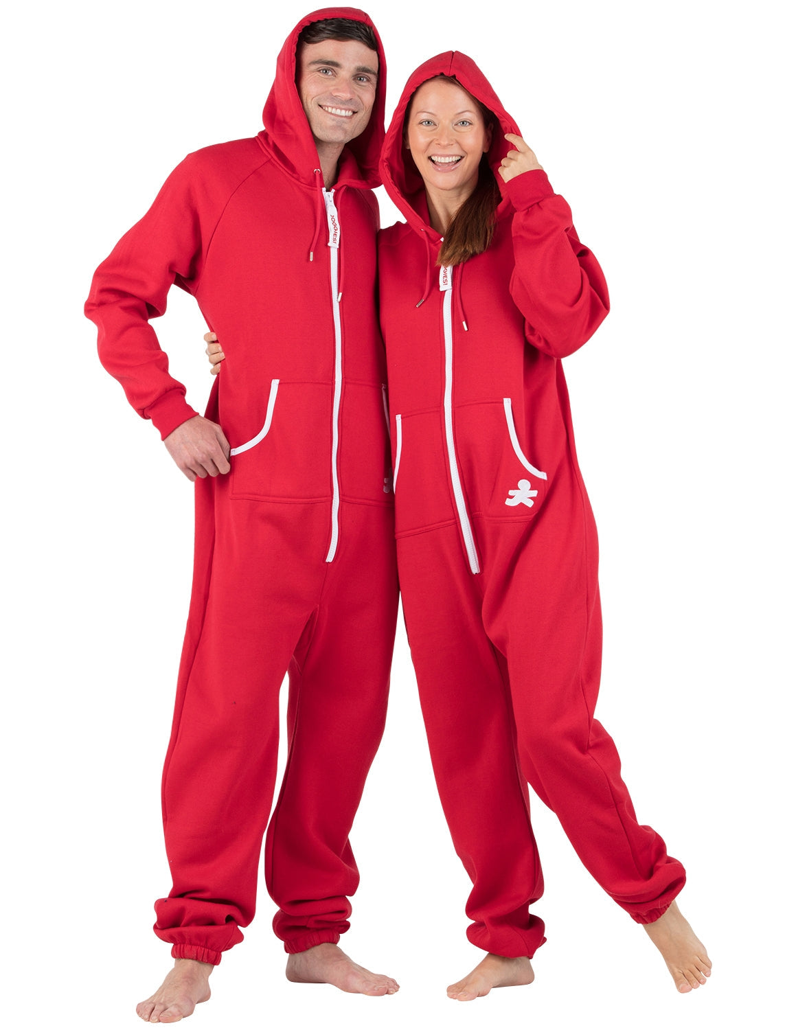 Joggies are the perfect mix between a track suit and one piece pajamas! Stylish and ultra-cozy! The thick sweatshirt fleece is ideal for walking the dog on the chilly mornings, enjoying a bonfire while camping, and for sleeping in, too! Roll out of bed ready for the day! Both women and men will love and look great in these bright red beauties! And an inclusive size chart makes these the best plus size onesie jogging suits!