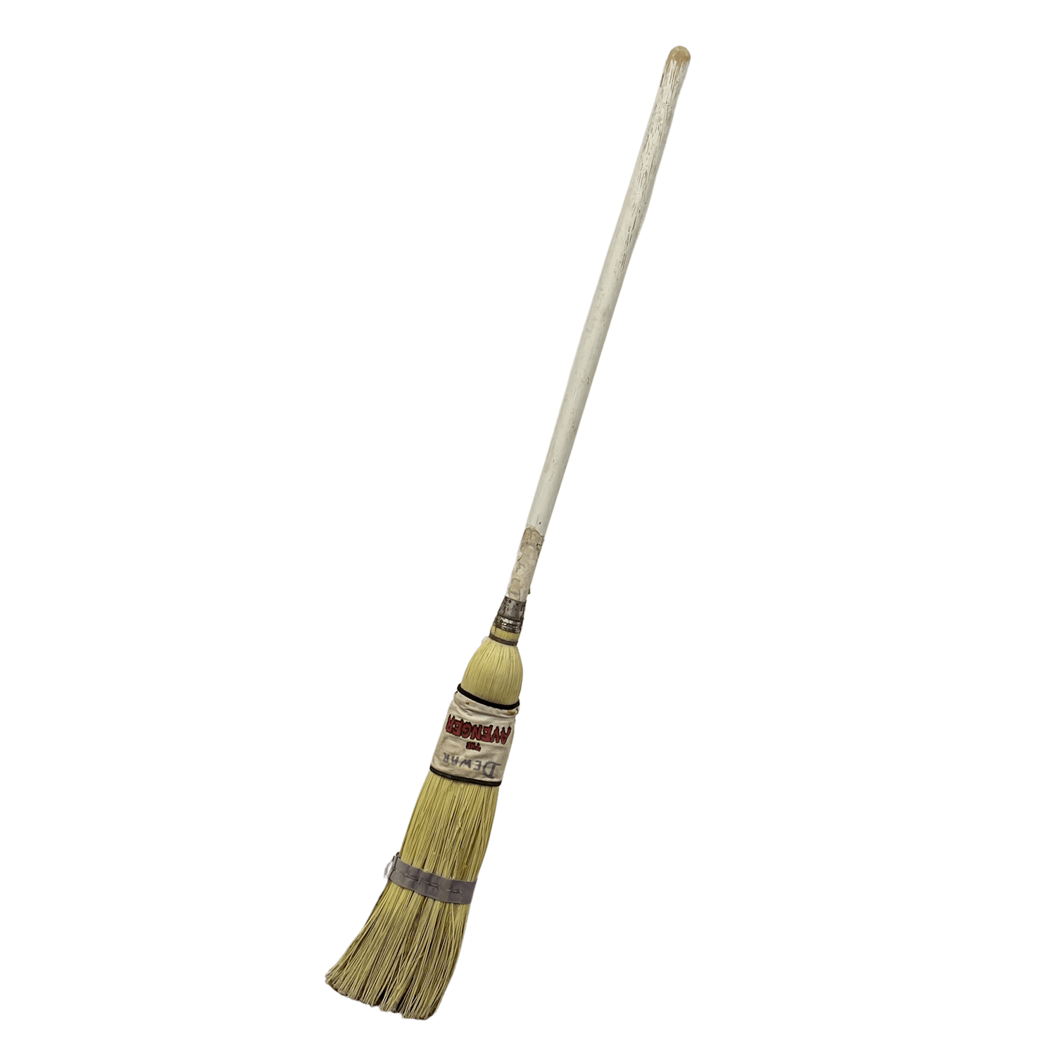 This vintage curling broom is in good condition and features a unique hybrid of natural bristles in the core and synthetic bristles on the outside. Minimal bristle breakage, stitching is tight, labels intact but faded, moderate paint loss on handle. Fabric label is in good condition but dirty. Bristles include a green vinyl insert in the core. Manufactured by Furgale Broom Co.