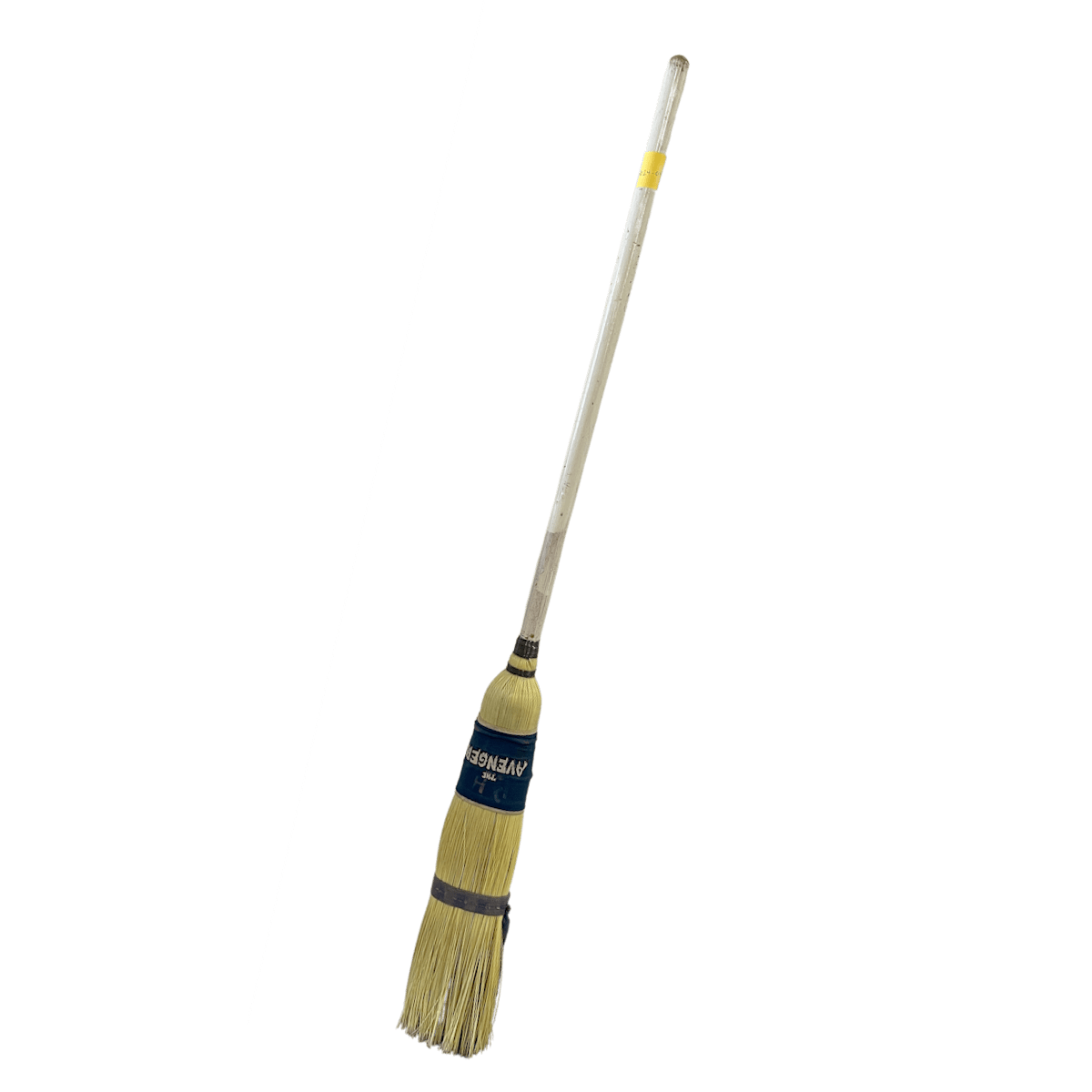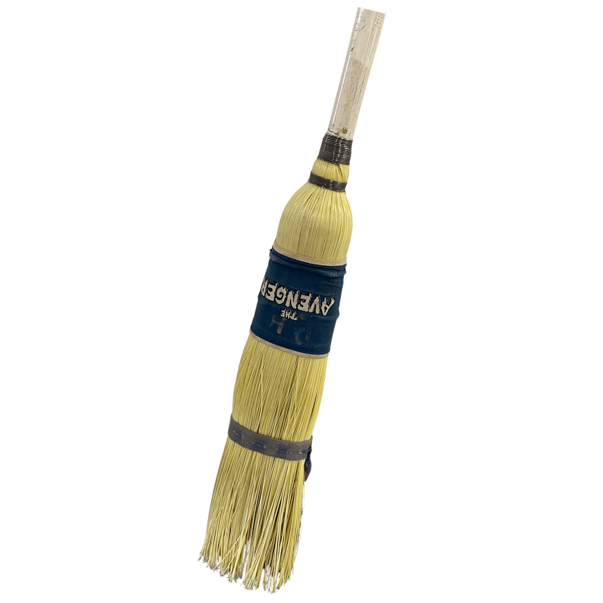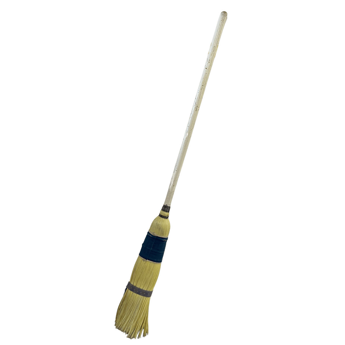 This vintage curling broom is in very good condition and features a unique hybrid of natural bristles in the core and synthetic bristles on the outside. Minimal bristle breakage, stitching is tight, labels mostly intact but faded, moderate paint loss on handle. Blue fabric label is an unusual color and the bristle tie is in good condition. Bristles include a vinyl insert in the core. Manufactured by Furgale Broom Co.