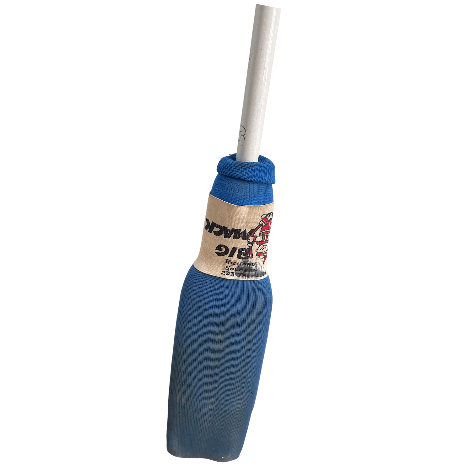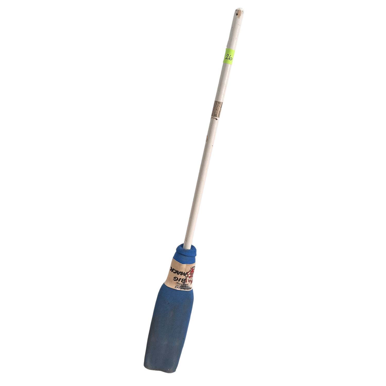 This vintage curling broom represents the bridge between corn brooms and modern fabric pad broom. The bristles are wrapped with blue knit fabric in good condition but is somewhat dirty and has a small hole on the back side. Minimal paint loss on handle. Manufactured by Hall-Mack Ent. Ltd..