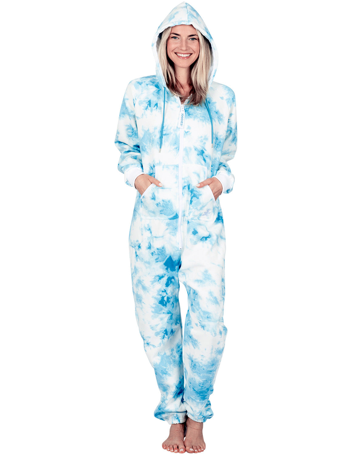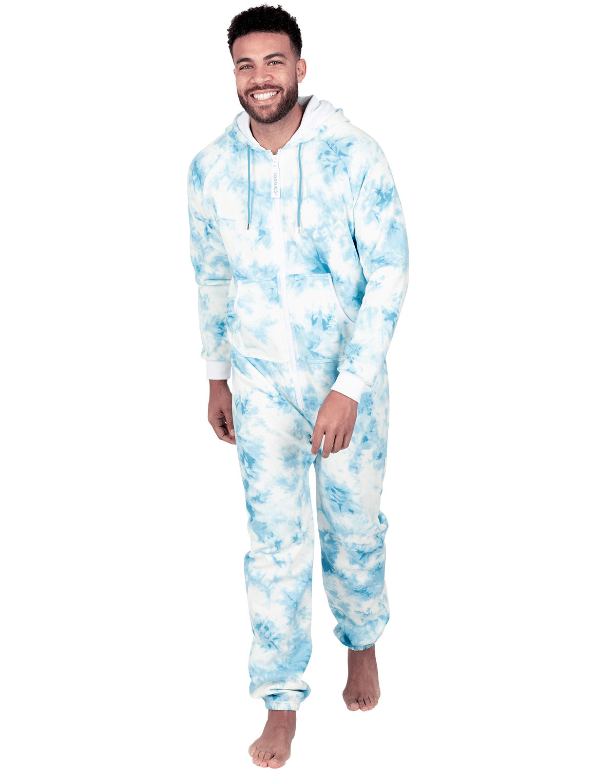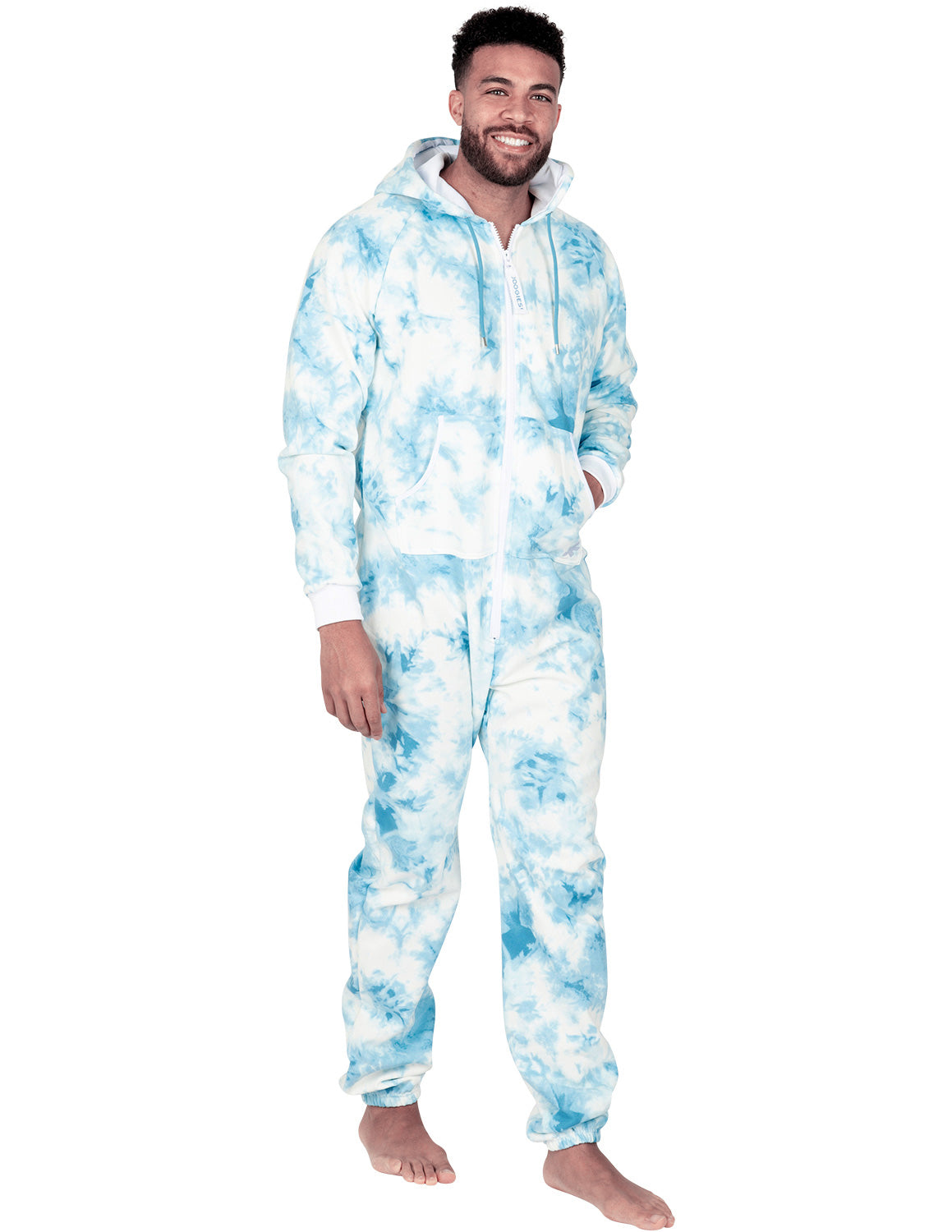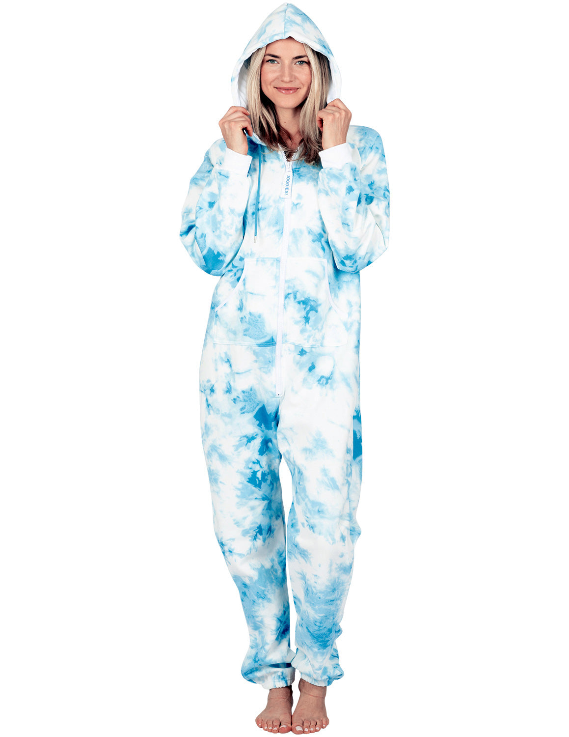 Joggies are the perfect mix between a sweat suit and onepiece pajamas! Stylish features include hoodies and pockets, and thick sweatshirt fleece makes them ultra-cozy! Ideal for walking the dog on the chilly mornings, enjoying a bonfire while camping and for sleeping in! Roll out of bed ready for the day! Both women and men will love and look gorgeous in blue on white tie dye! An inclusive size chart complete with big/tall and plus sizes allows everyone the perfect fit in these fun and convenient jogging suit rompers!